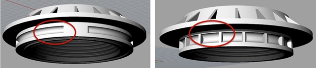 Lo spessore della parte nella parte inferiore del progetto originale (a sinistra) è stato ridotto a 1 mm (a destra).