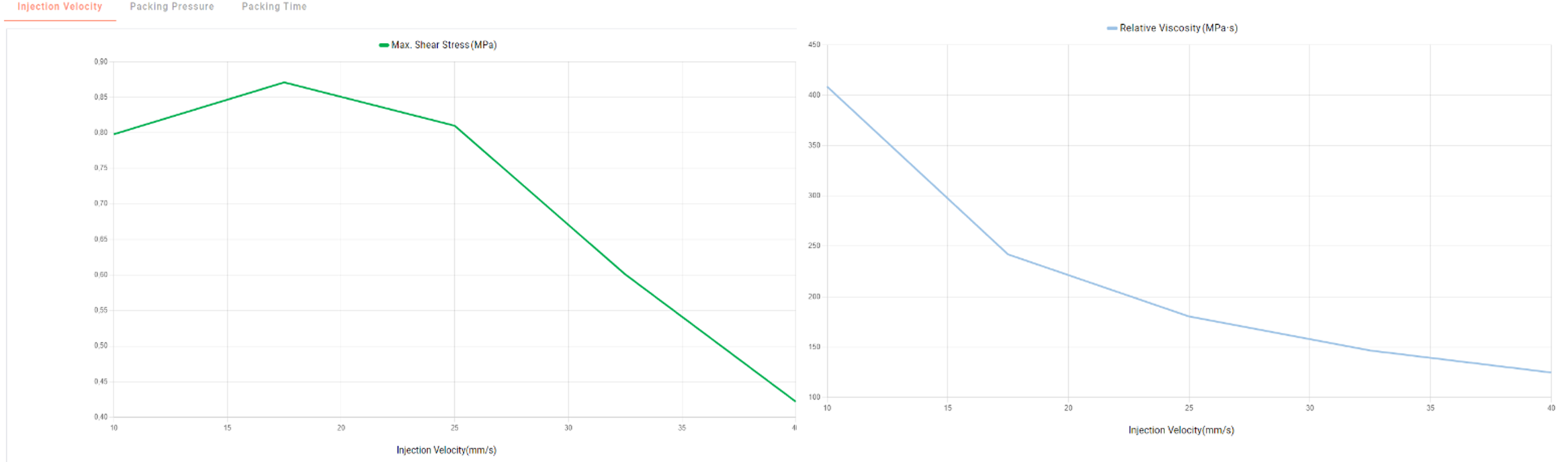 Mi fornisce dei grafici in cui posso vedere i limiti degli shear rate e stress, le pressioni come variano, la richiesta di tonnellaggio di chiusura stampo. In tal modo ho degli strumenti che permettono di darmi indicazioni di come variano i risultati, nel caso dovessi andare a cercare dei punti specifici di ottimizzazione.